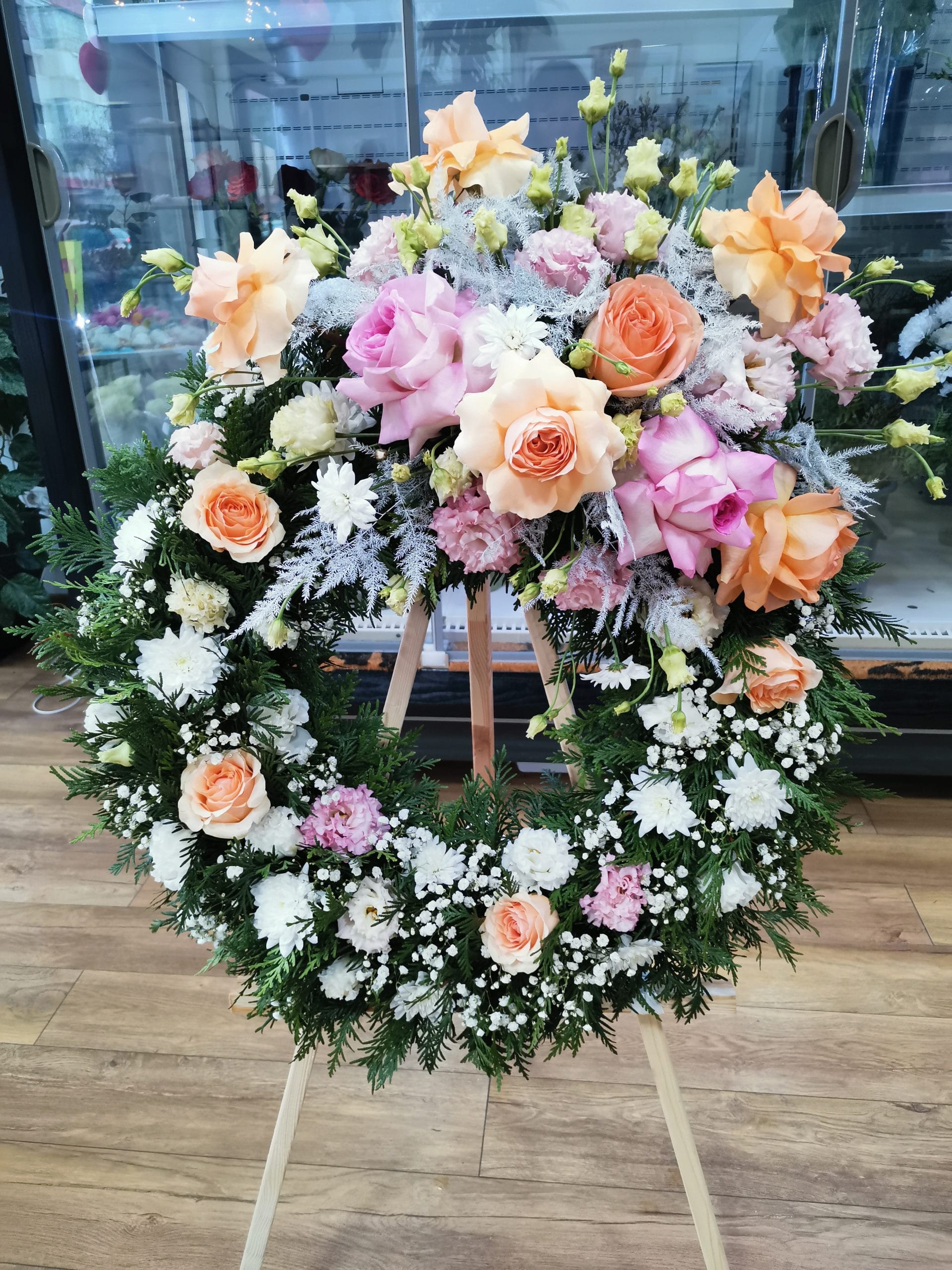 Coroana este realizata pe suport circular din polistiren, cu burete floral. Florile, naturale, sunt aranjate in burete. Culorile si florile pot varia, in functie de preferinte. In fotografia de produs avem o coroana cu flori albe. Acest tip de coroana este unul din produsele preferate de catre clientii nostri. Florile si culorile pot diferi, in functie de stoc dar si de cum doresti.